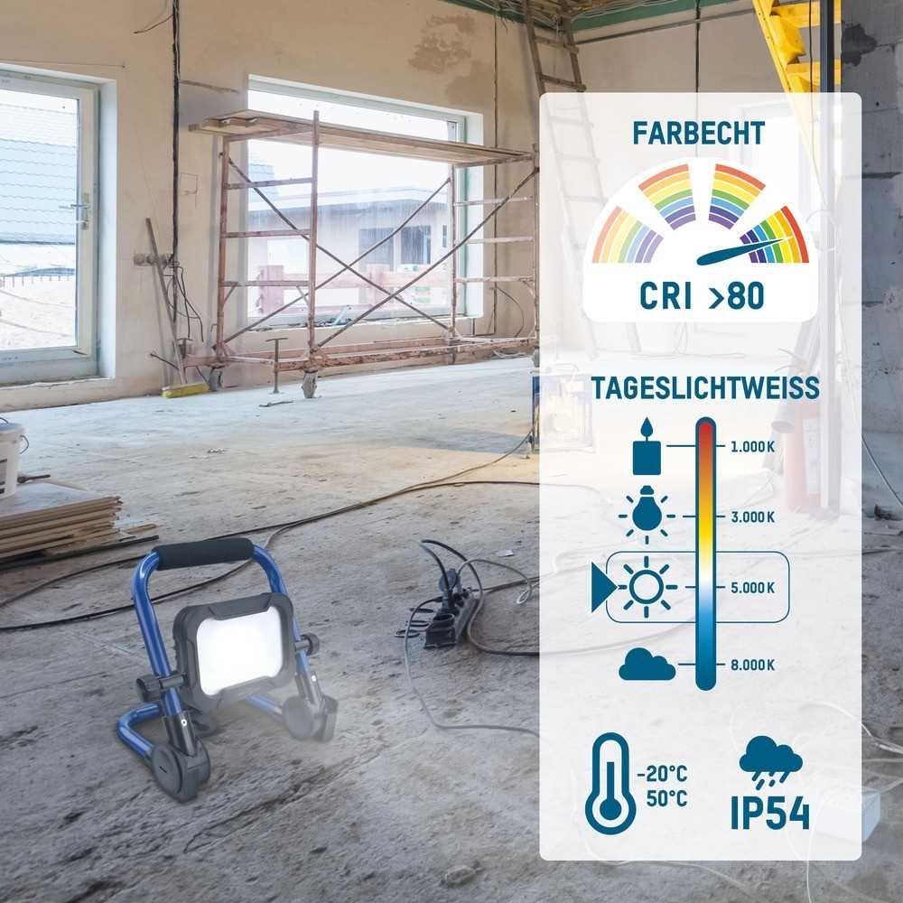 Geeignet für Handwerkertätigkeiten mit hohem Lichtbedarf ohne eine Steckdose in der Nähe, kompaktes Design, mobil dank Akku und gute Lichtwerte sorgen für ein angenehmes Arbeiten
