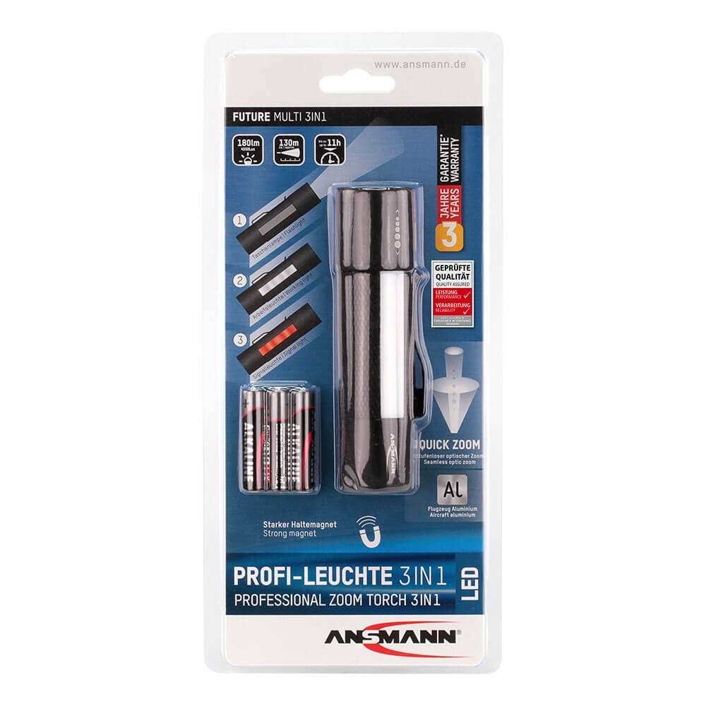 Die innovative Multifunktionsleuchte FUTURE Multi 3in1 von ANSMANN integriert drei Lampen in einer Leuchte - fokussierbare Taschenlampe, Arbeitsleuchte und Signal-Blinklicht. Sie ist somit optimal geeignet als universeller Helfer für unterwegs. Die Leuchte ist nahezu immer und überall einsetzbar, ob als professionelle Taschenlampe in Dunkeln, zum Ausleuchten bei Arbeiten unterwegs oder zur Sicherung von Gefahrenstellen im Straßenverkehr.