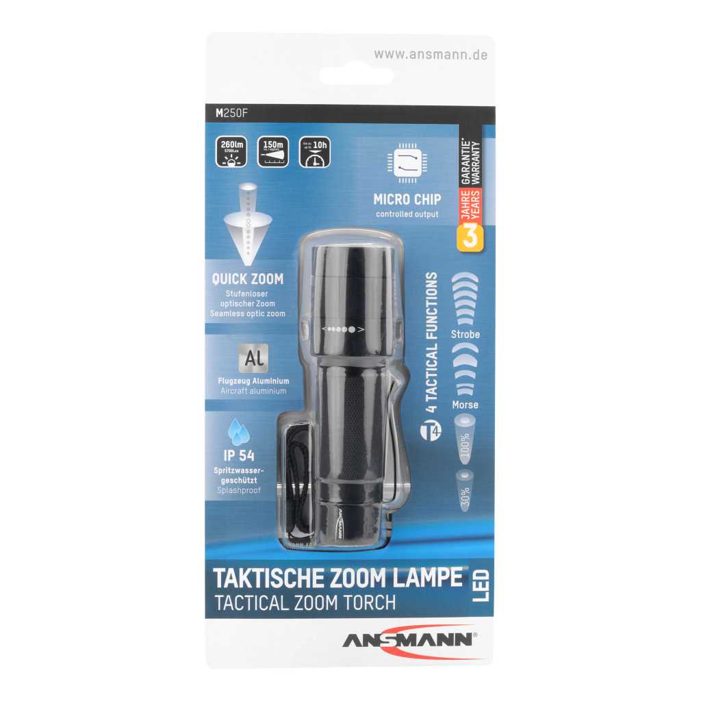 Die professionelle Taschenlampe M250F von ANSMANN besticht durch ihre optimalen Gehäuseproportionen und griffige Oberfläche. In Verbindung mit dem mikrokontrollergesteuerten Endkappenschalter ist die M250F für taktische Einsatzgebiete geeignet und erlaubt im Betrieb das lautlose Schalten der drei Leuchtfunktionen 100% Leuchtkraft, 30% Leuchtkraft oder Stroboskoplicht durch leichtes Antippen des Schaltknopfes. Des weiteren ist das lautlose Morsen im noch ausgeschalteten Zustand der Leuchte möglich. Durch die robuste und sehr griffige Gehäuseoberfläche ist die Taschenlampe M250F ideal für den rauen Einsatz, auch im Einhandbetrieb oder mit Handschuhen.