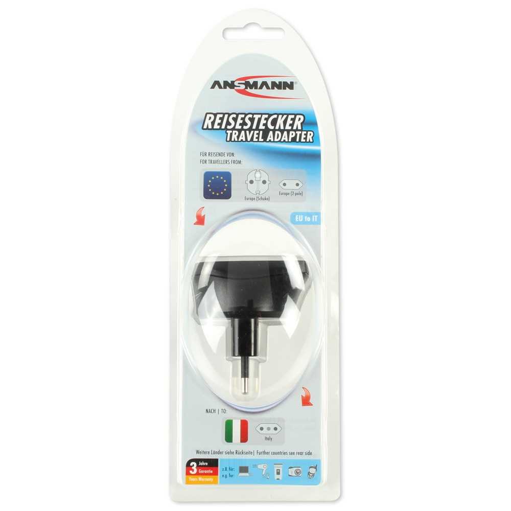 Ob Geschäfts- oder Privatreisender, jeder kennt das Problem: Das mitgebrachte Elektrogerät kann im Reiseland nicht benutzt werden, weil der Stecker nicht passt. Genau dafür hat ANSMANN die idealen Reisebegleiter im Programm: ANSMANN Reisestecker sind absolut sicher, immer verlässlich und von höchster Qualität. Dank integriertem Schutzleiter können sogar 3-polige Geräte mit Schuko-Stecker kontaktiert werden. Ob Laptop, Haartrockner, Rasierapparat, Digitalkamera oder Handy - die ANSMANN Reisestecker sorgen für grenzenlose Energie in über 150 Ländern weltweit. Selbstverständlich werden dabei alle relevanten internationalen Sicherheitsnormen eingehalten. Mit dem Reisestecker „EU to IT“ lassen sich vor Ort Geräte mit Schuko- oder Euro-Stecker anschließen. Er ist für Reisen in folgende Länder geeignet: Äthiopien, Albanien, Chile, Italien.