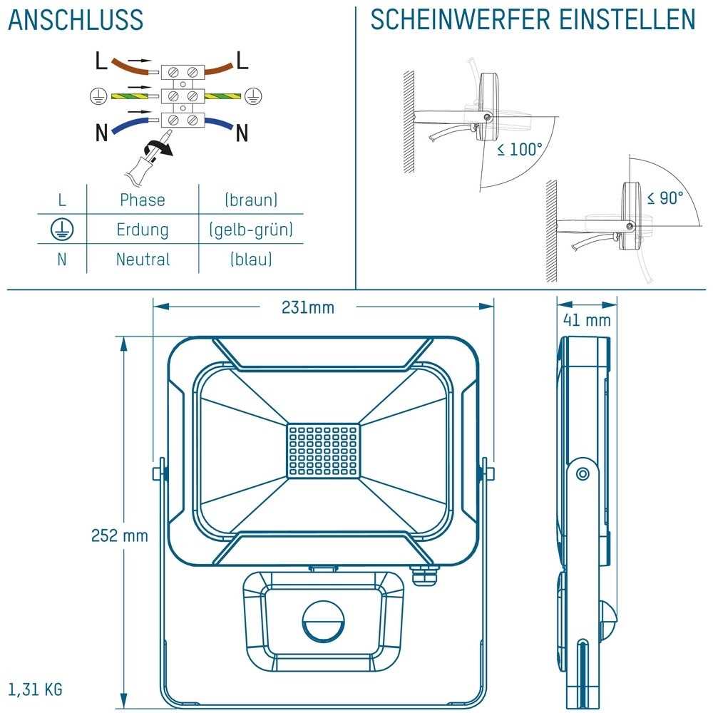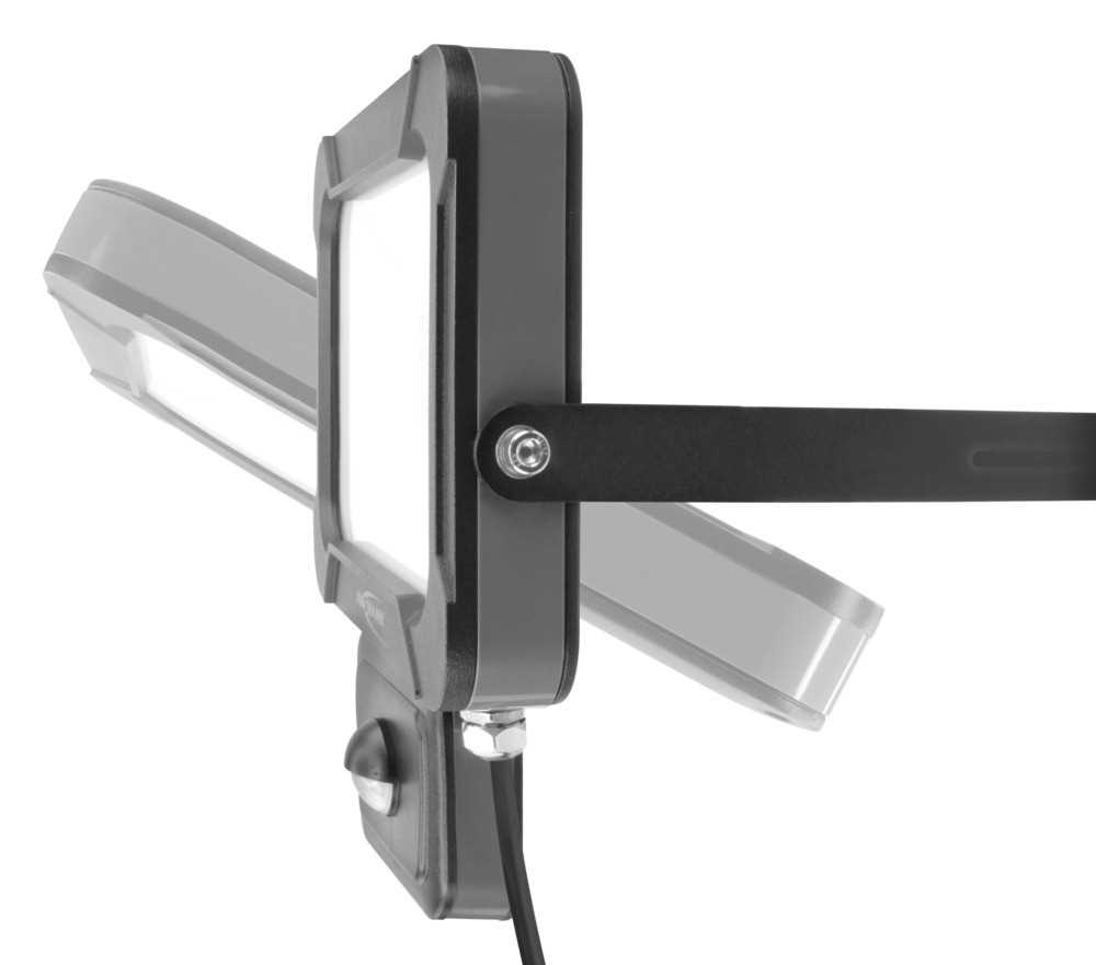 Strahler mit 30W LED erzeugt eine Leuchtleistung von 1600lm (Lebensdauer: 50.000h). Der Abstrahlwinkel der Lampe beträgt 110°, wobei sich der Lampenkopf für eine ideale Ausleuchtung stufenlos verstellen lässt
