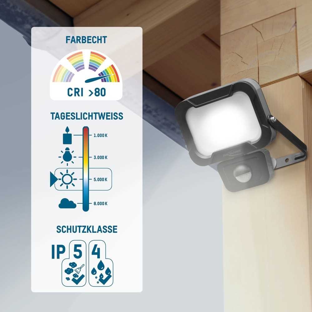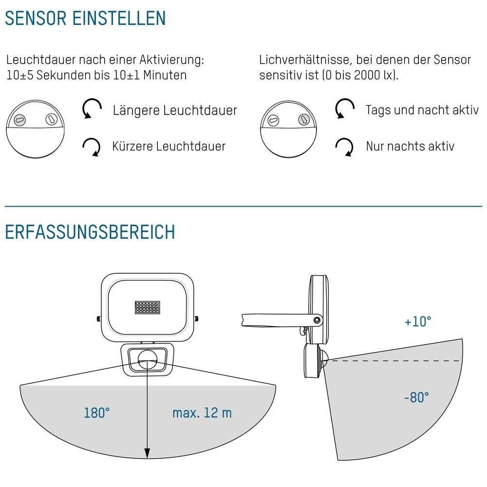 Der Motion Sensor des Scheinwerfer lässt sich einfach und individuell einstellen: Leuchtdauer (10sec bis 10min), Aktivierungshelligkeit (0 bis 2000lx), Erfassungsbereich (max. 12m bei 180° Sensorfeld)