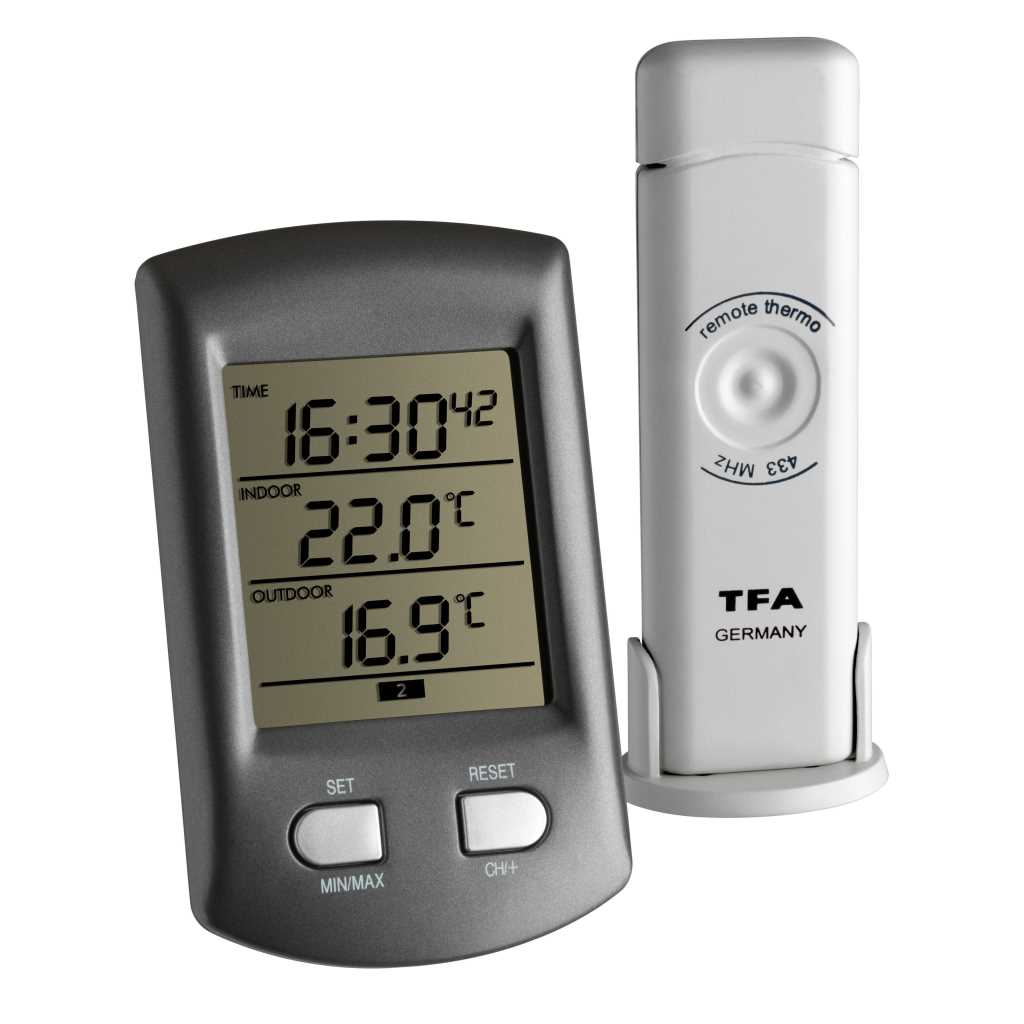 • kabellose Übertragung der Außentemperatur über bis zu 3 Sender (max. 100 m)