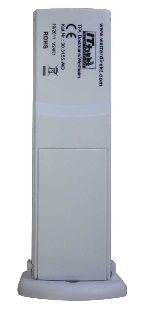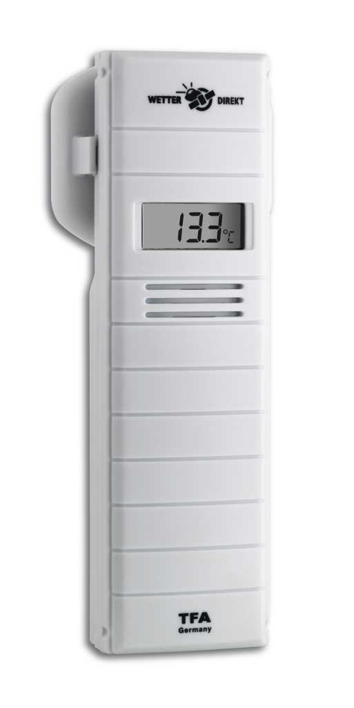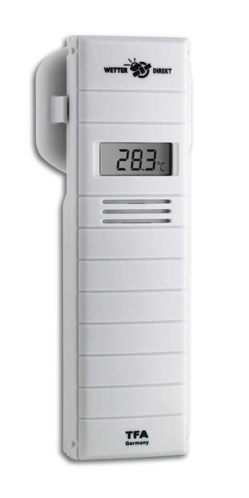 BeschreibungMerkmaleSicherheitsbestimmungenBewertungenDownloads Beschreibung • für WETTERdirekt • zum Hängen oder Stellen • 39 (51) x 21 (46) x 129 (135) mm • 45 g • 2x 1,5 V AA Merkmale Abmessungen 39 (51) x 21 (46) x 129 (135) mm Batterien 2 x 1,5 V AA Gewicht 45 g MHz 868 Sicherheitsbestimmungen Hersteller nach GPSR TFA Dostmann GmbH & Co. KG Zum Ottersberg 12 97877 Wertheim | Reicholzheim Germanyinfo@tfa-dostmann.de WEEE-Nummer: DE 78184127 Bewertungen Geben Sie die erste Bewertung ab Es liegen keine Bewertungen vor Downloads